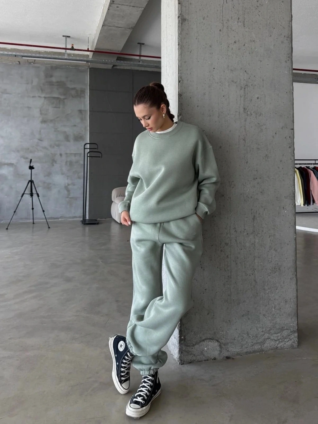 Eşofmanın mint rengi, enerjik ve fresh bir görünüm sağlarken, şardon detayı da şık bir dokunuş katıyor.