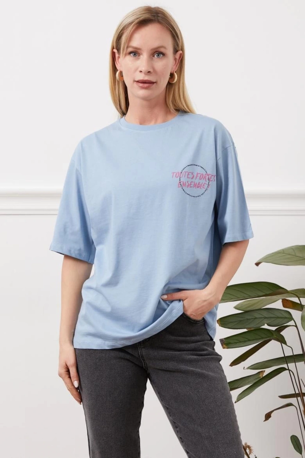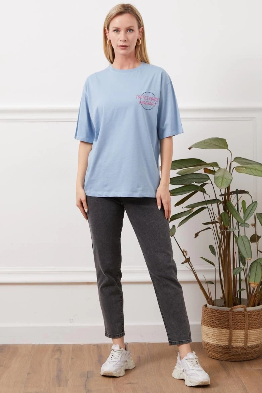 Bu mavi tişörtü günlük hayatta jean pantolonlarınızla kombinleyerek şık ve rahat bir görünüm elde edebilirsiniz.
