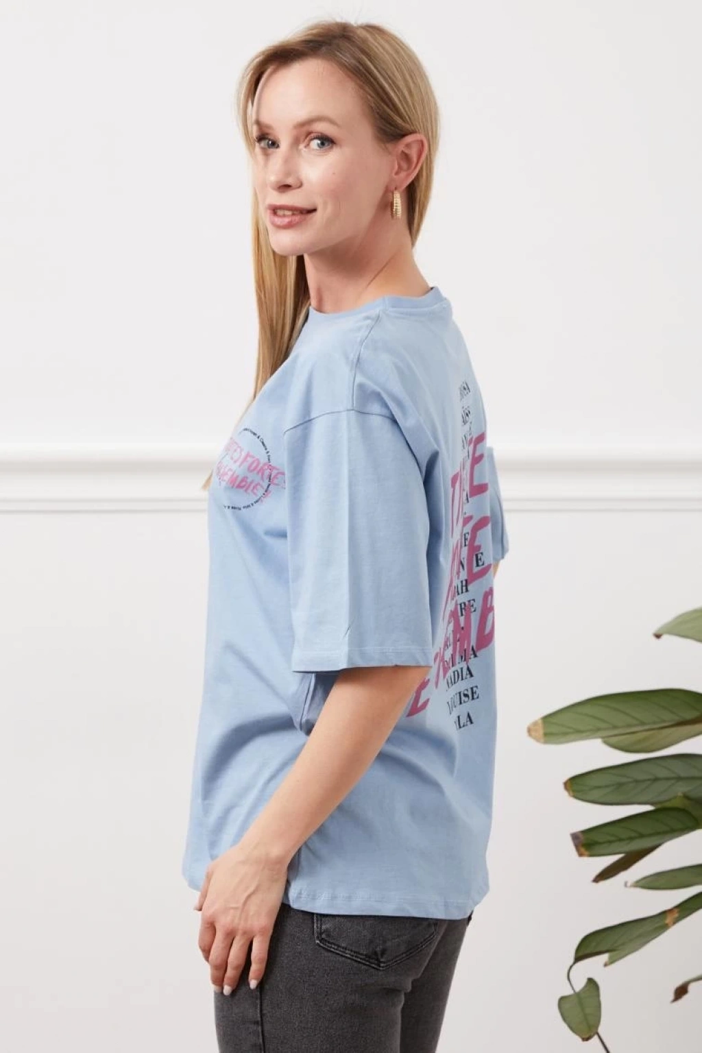 KAZAX marka mavi baskılı tişört, gardırobunuza şıklık katacak bir parça olarak öne çıkıyor.