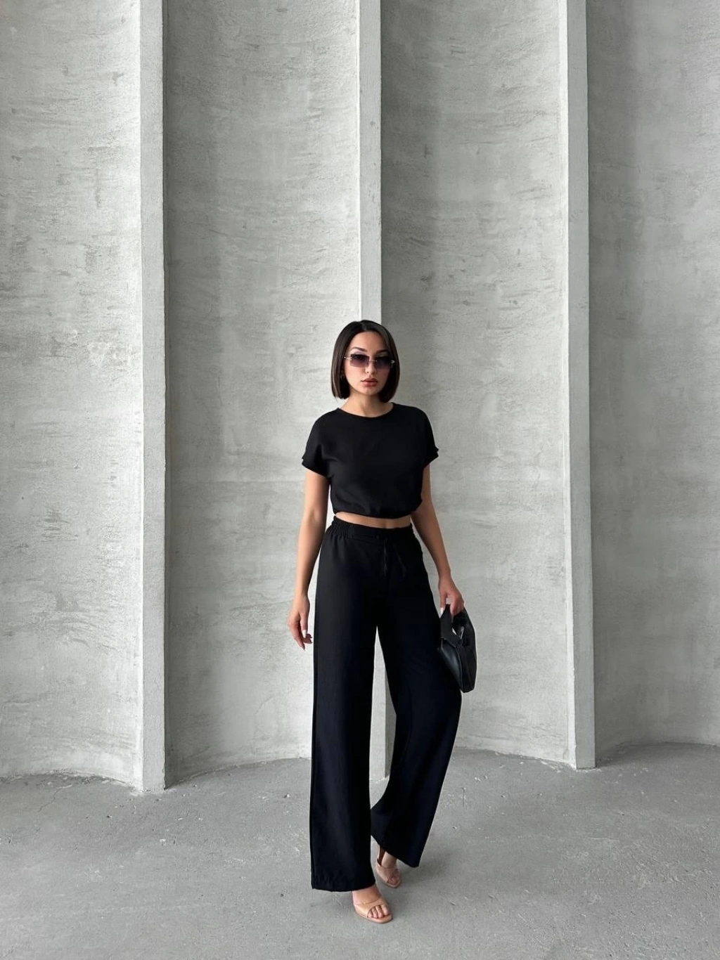 • Bluzunun düz kesimi ve pantolonunun yüksek bel tasarımı ile trend bir stil sunar.