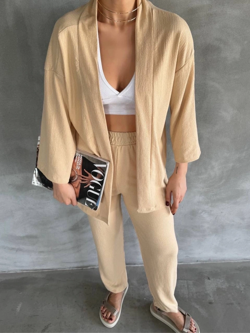 Bu bürümcük kumaş yakımlı kadın giyim takımı ile hem şık hem de rahat bir tarz yaratmak artık çok daha kolay.
