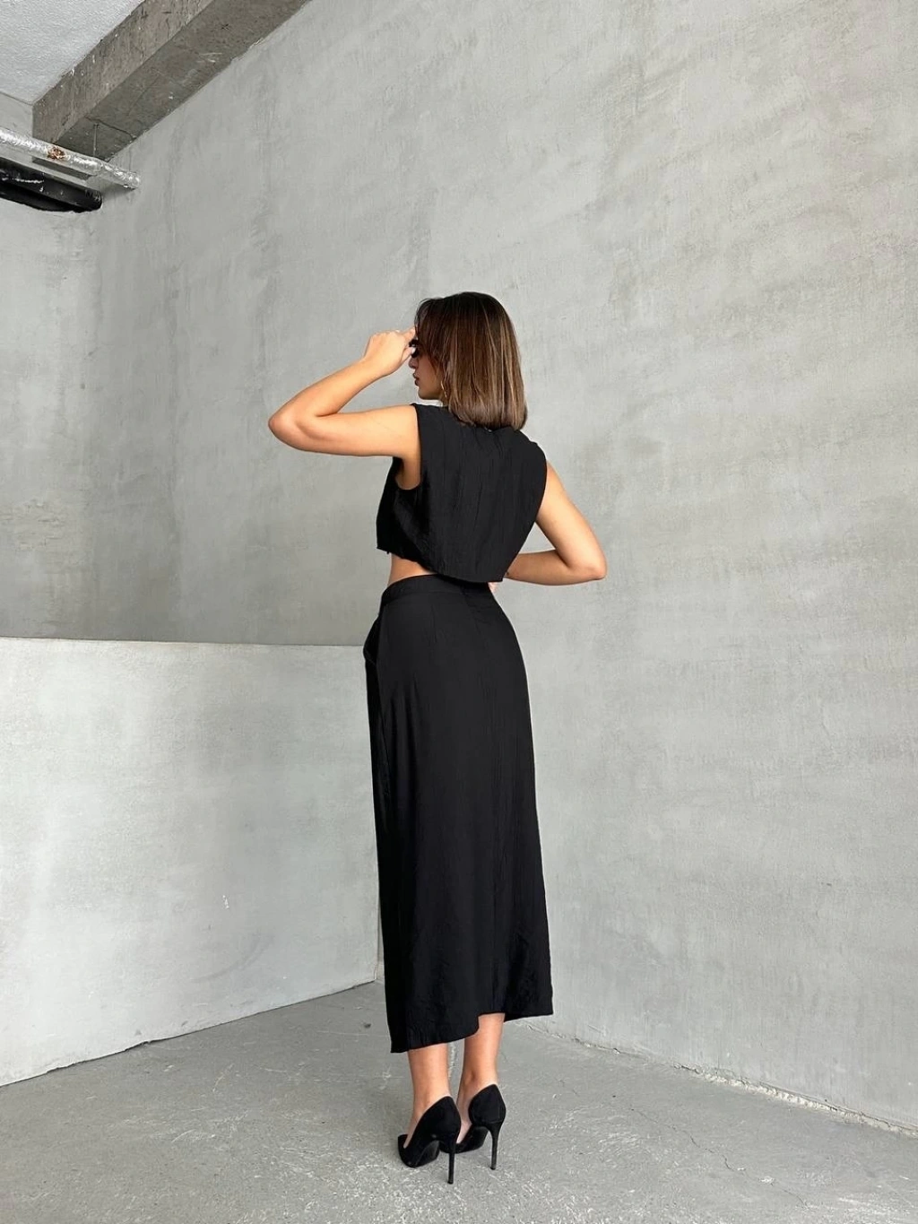 KAZAX markasının şık ve zarif tasarımıyla öne çıkan çilek takımı, etek ve yelek kombinasyonuyla dikkat çekiyor.