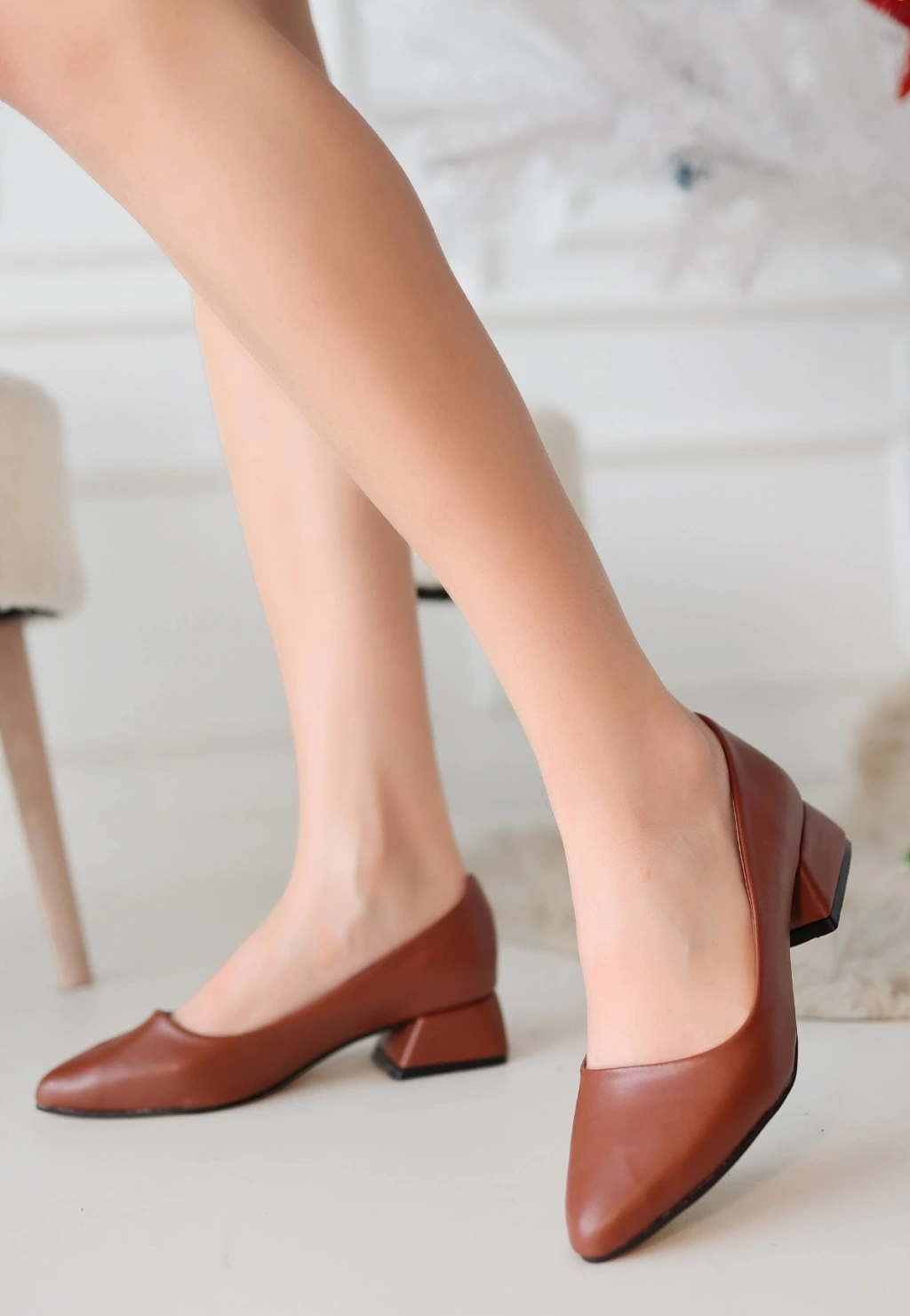 • Desniy Taba Cilt Topuklu Ayakkabı