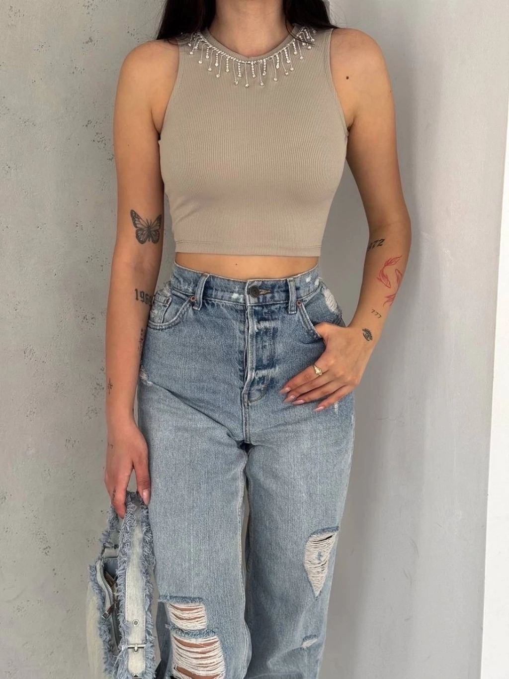 fitilli kaşkorse yakası zincirli atlet vizon