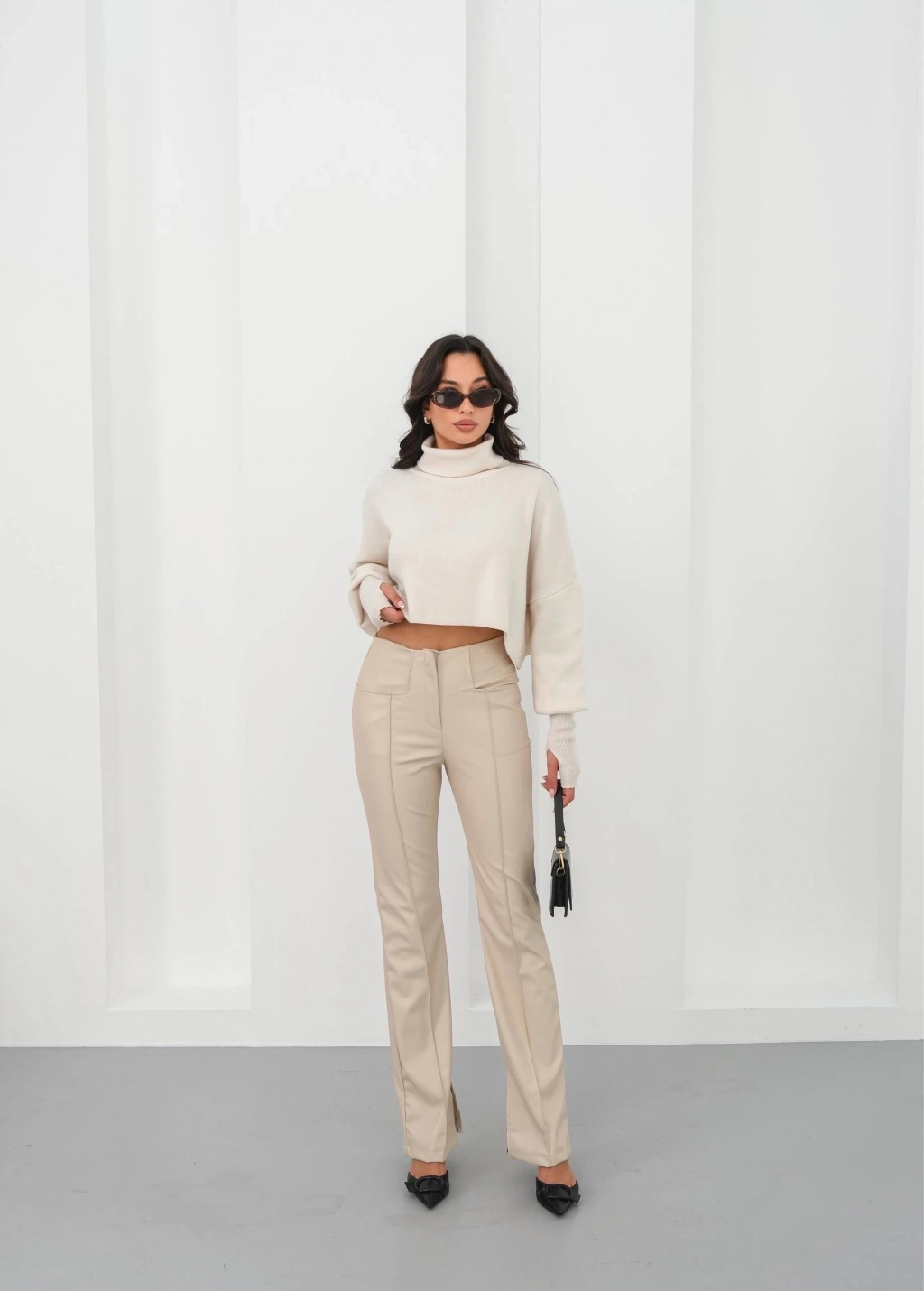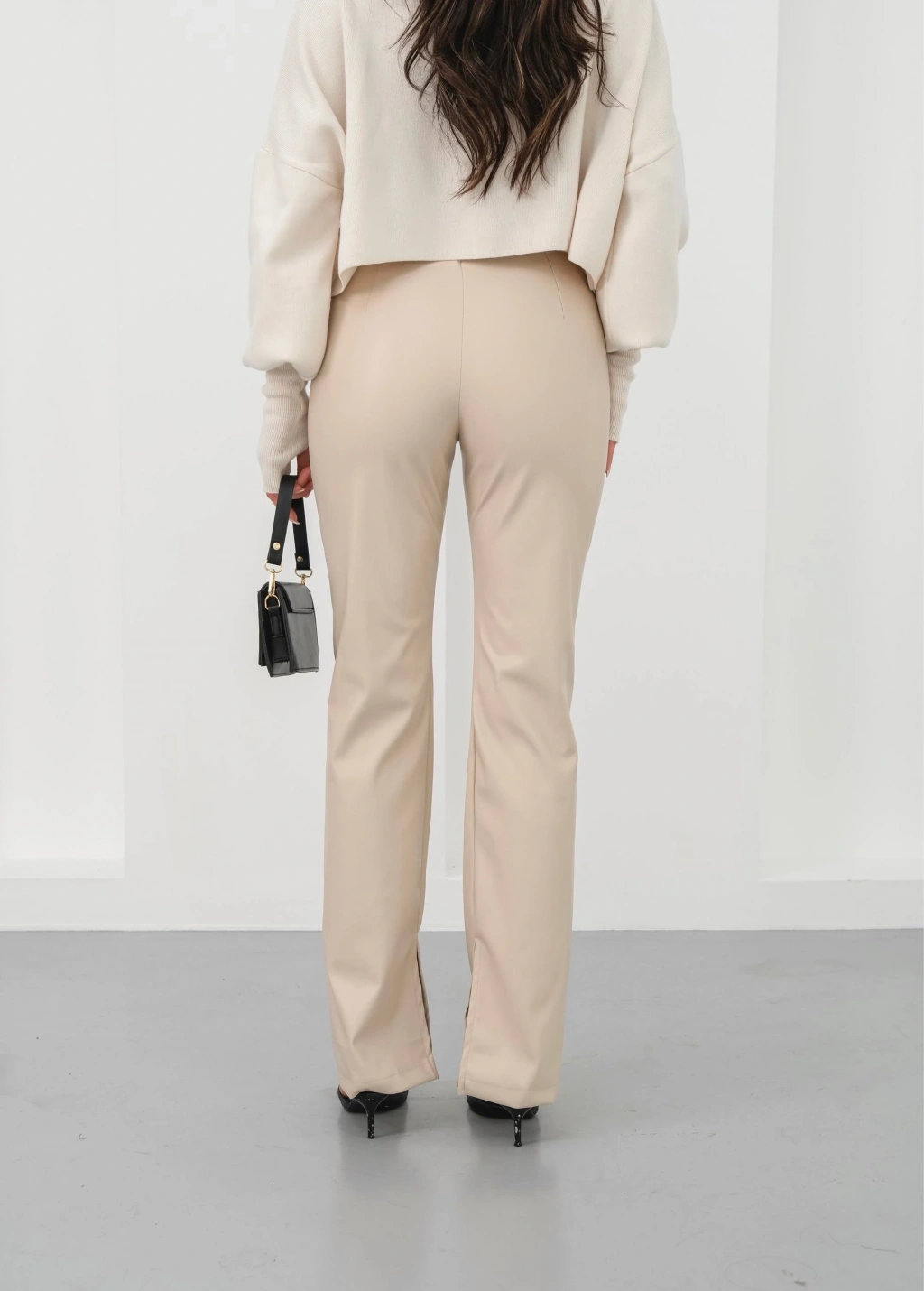 İspanyol yırtmaçlı paça deri pantolon, şıklığı ve rahatlığı bir arada sunar.