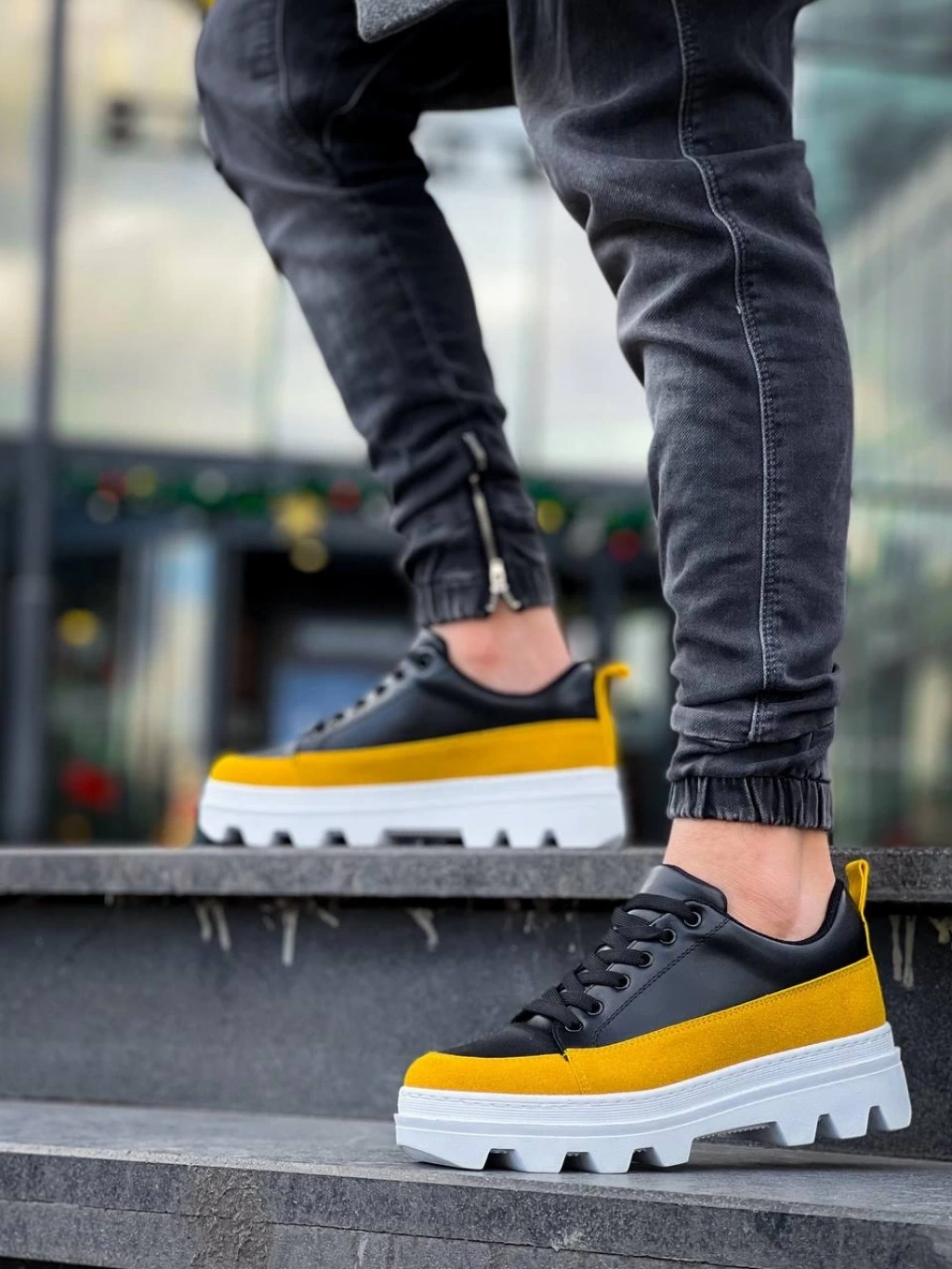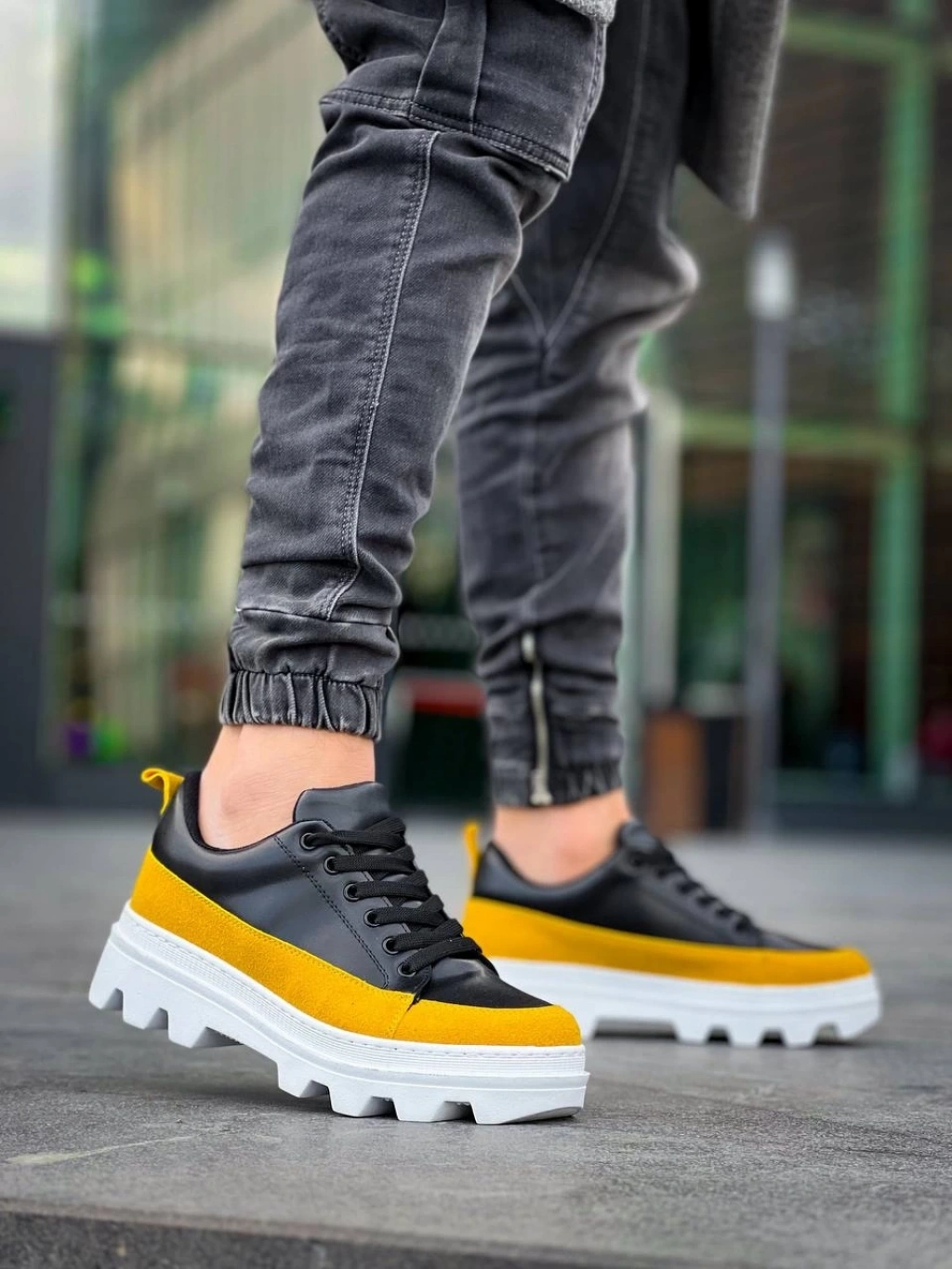 • KB-056 Kuback Siyah Sarı Detaylı Beyaz Yüksek Taban Günlük Spor Ayakkabı