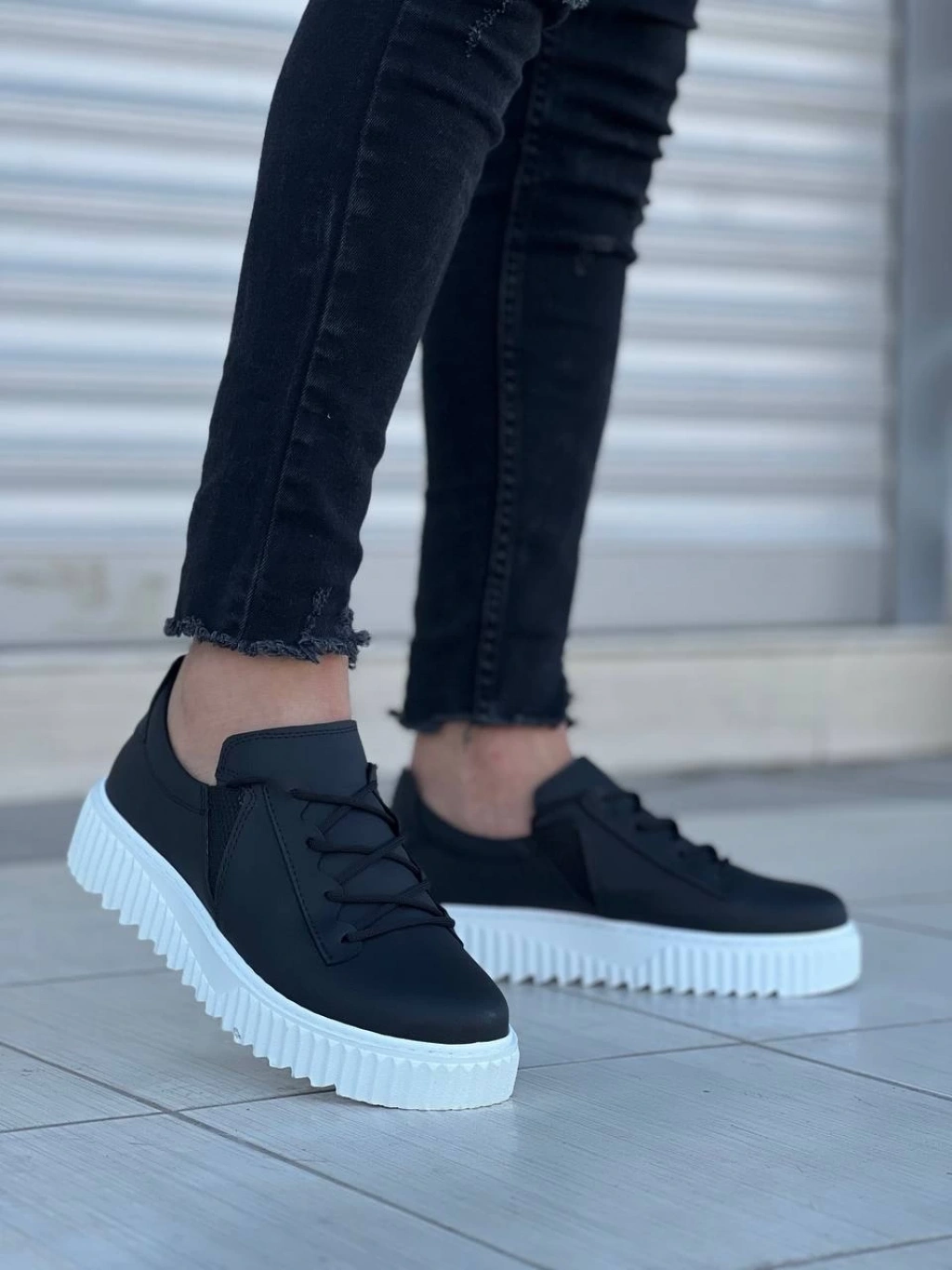 • KB-X502 Kuback Siyah Cilt Yüksek Beyaz Taban Bağcık Detaylı Lastikli Günlük Erkek Ayakkabı