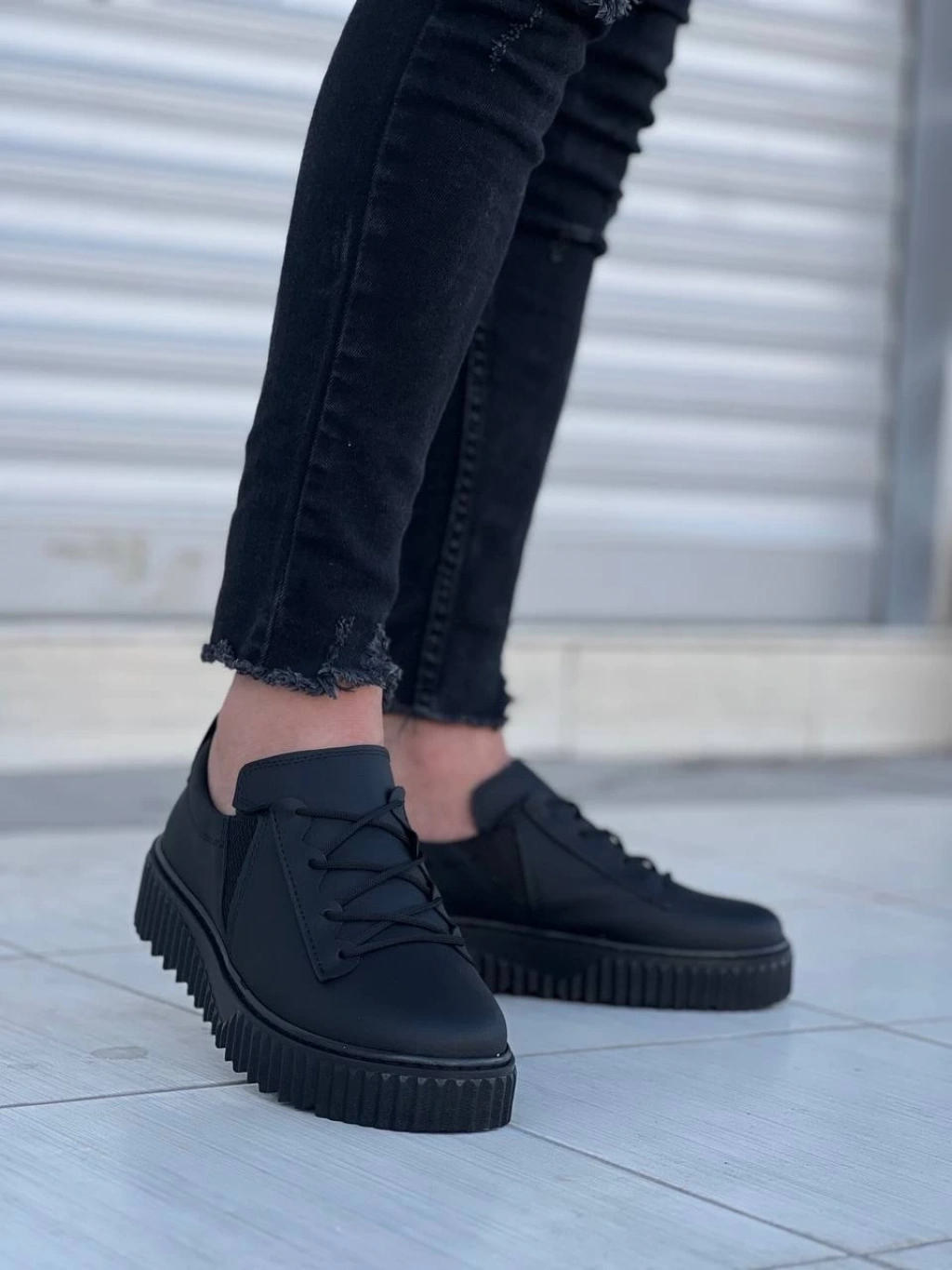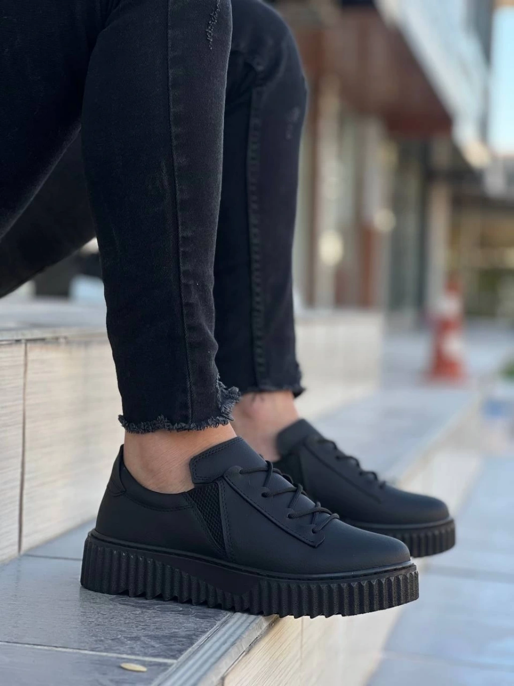 • KB-X502 Kuback Siyah Cilt Yüksek Siyah Taban Bağcık Detaylı Lastikli Günlük Erkek Ayakkabı