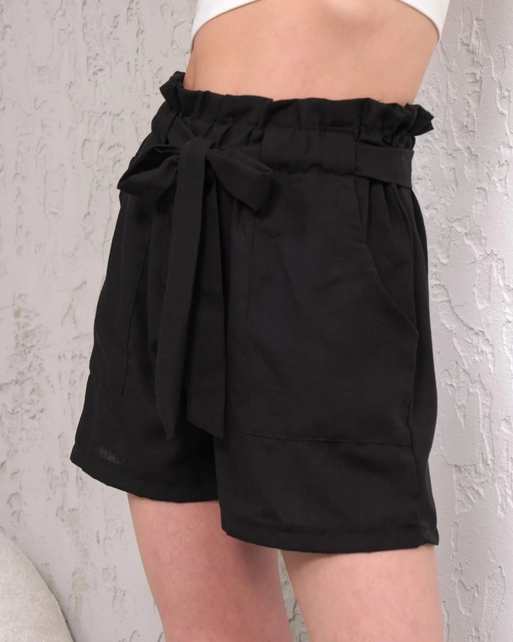 Bu sezonun trend parçalarından biri olan kuşaklı keten şort siyah s255265, şıklığı ve rahatlığı bir arada sunuyor.