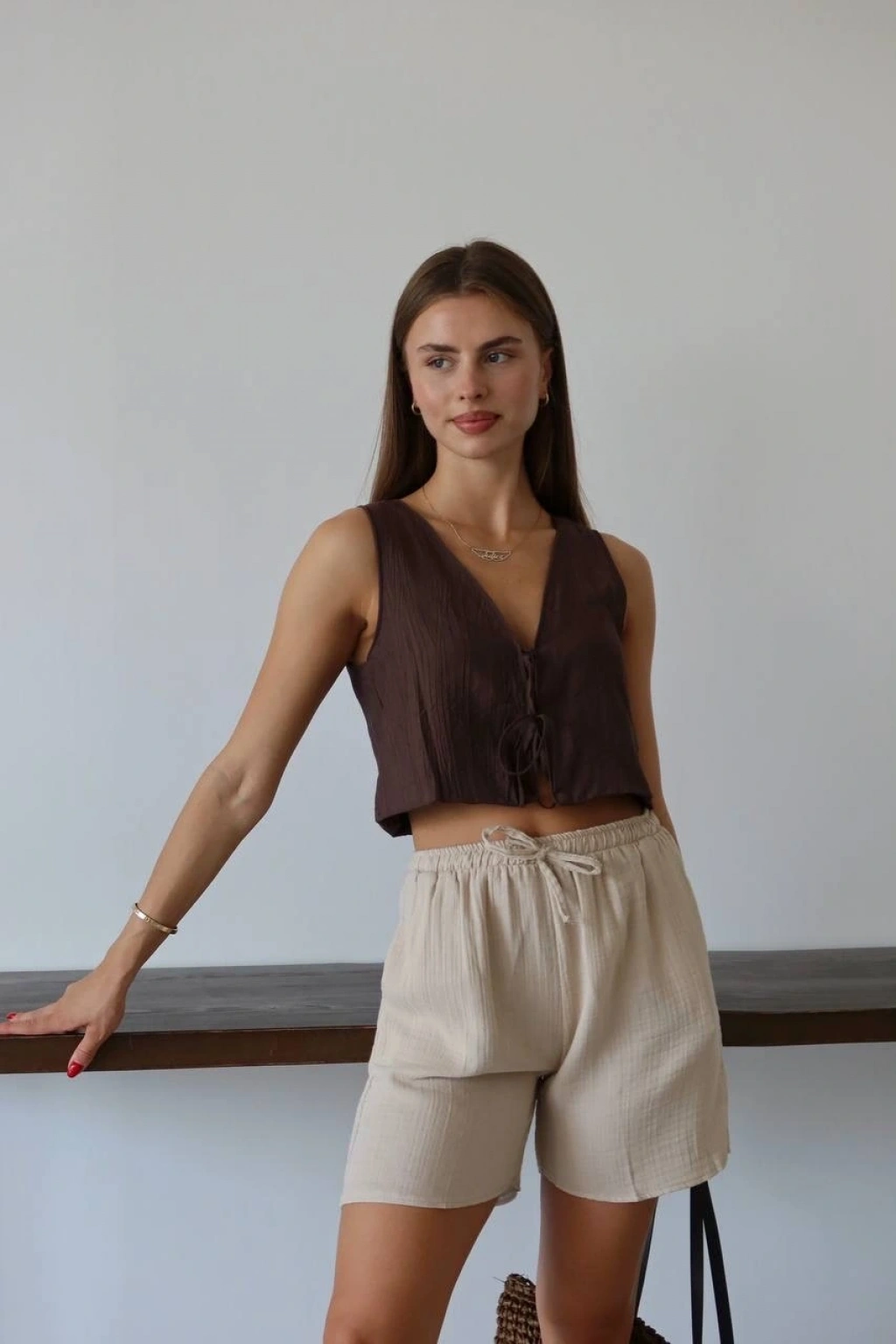 Bu bağcıklı bej şort, hem şık hem de rahat bir seçenektir. Müslin kumaştan üretilmiş olan bu şort, yaz aylarında vazgeçilmeziniz olmaya aday. İster günlük kombinlerinizde ister plajda şık bir alternatif arıyorsanız, bu şort tam size göre!