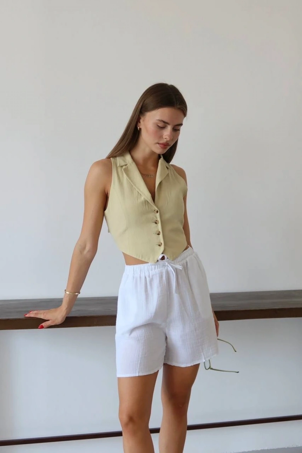Kadınların yaz aylarında rahatlıkla tercih edebileceği şık ve şort modeli: Müslin kumaş şort bağcıklı beyaz PT!