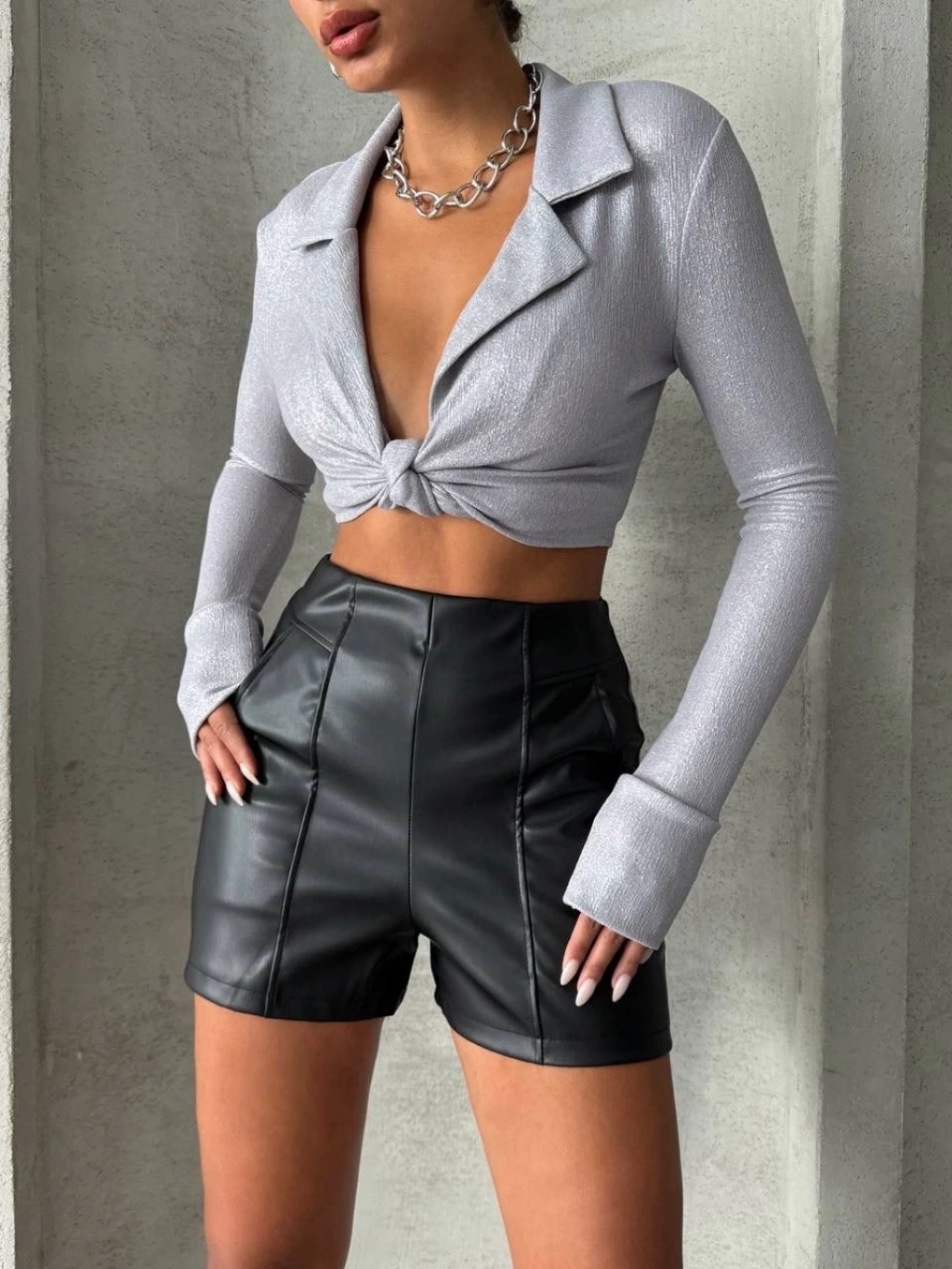 Bu şık ve şıklık arayan kadınlar için ideal olan siyah deri şort, gardırobunuzun vazgeçilmezi olmaya aday. Parçalı cepli tasarımı ile hem şık hem de kullanışlı bir görünüm sunar.