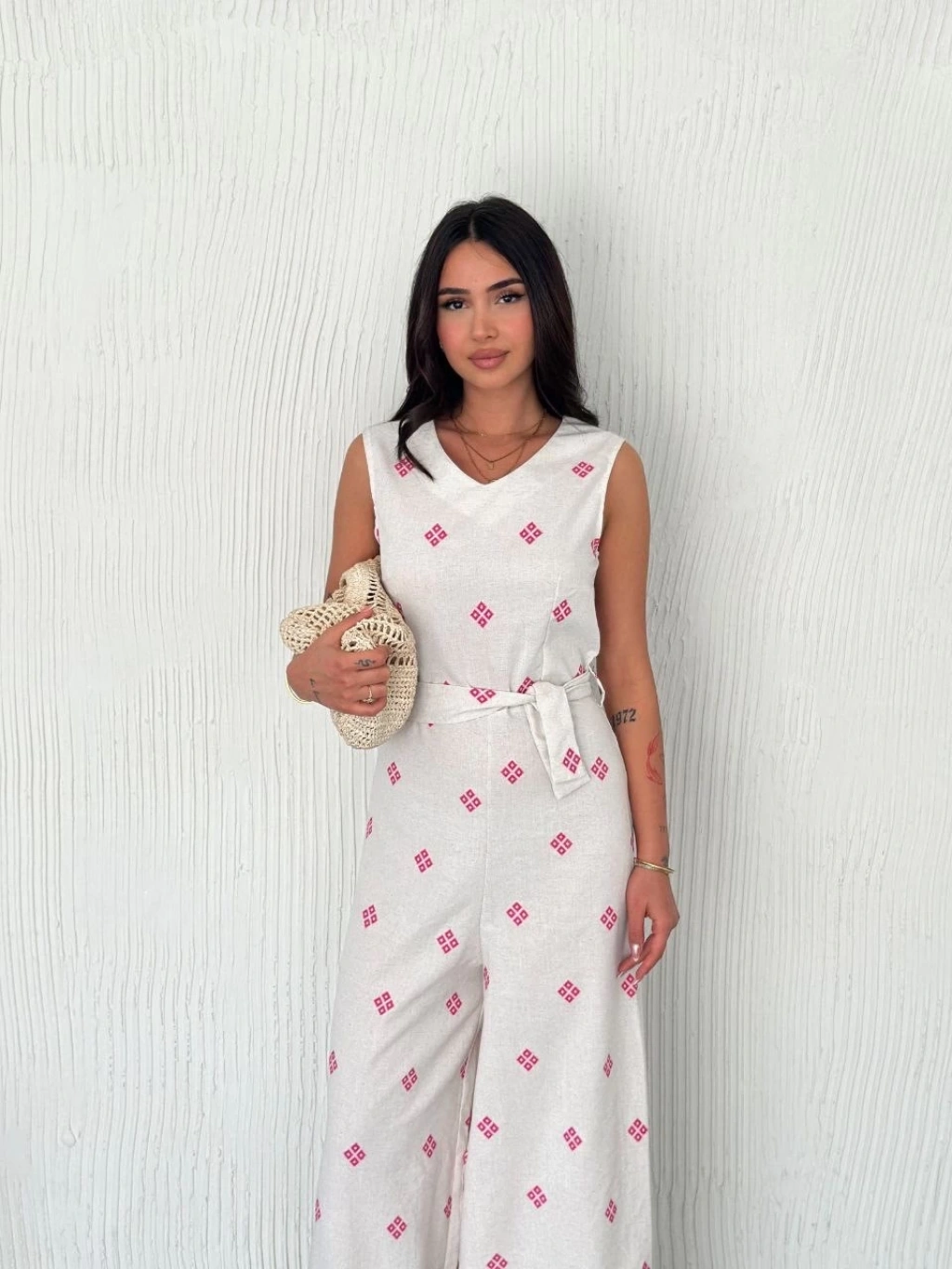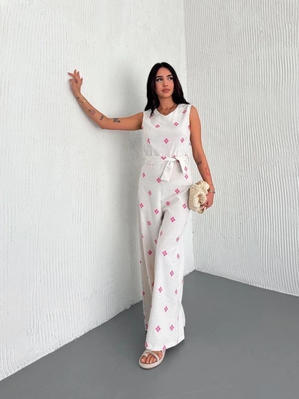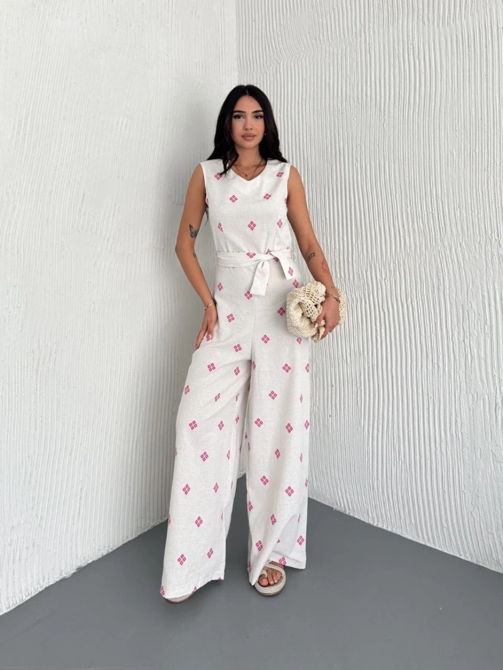 Sırt dekolteli keten beyaz tulum, gardırobunuzun şıklığını tamamlayacak harika bir seçenektir.