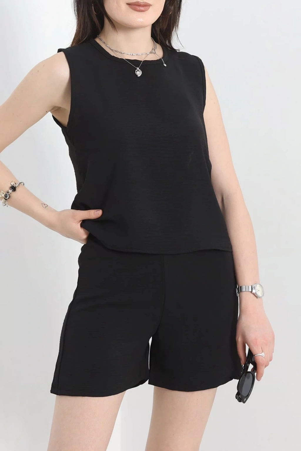 Ayrobin Şortlu Takım, şıklığı ve rahatlığı bir arada sunar. Siyah rengi ile her mekâna uyum sağlayan bu takım, kadınların favorisi olmaya aday.