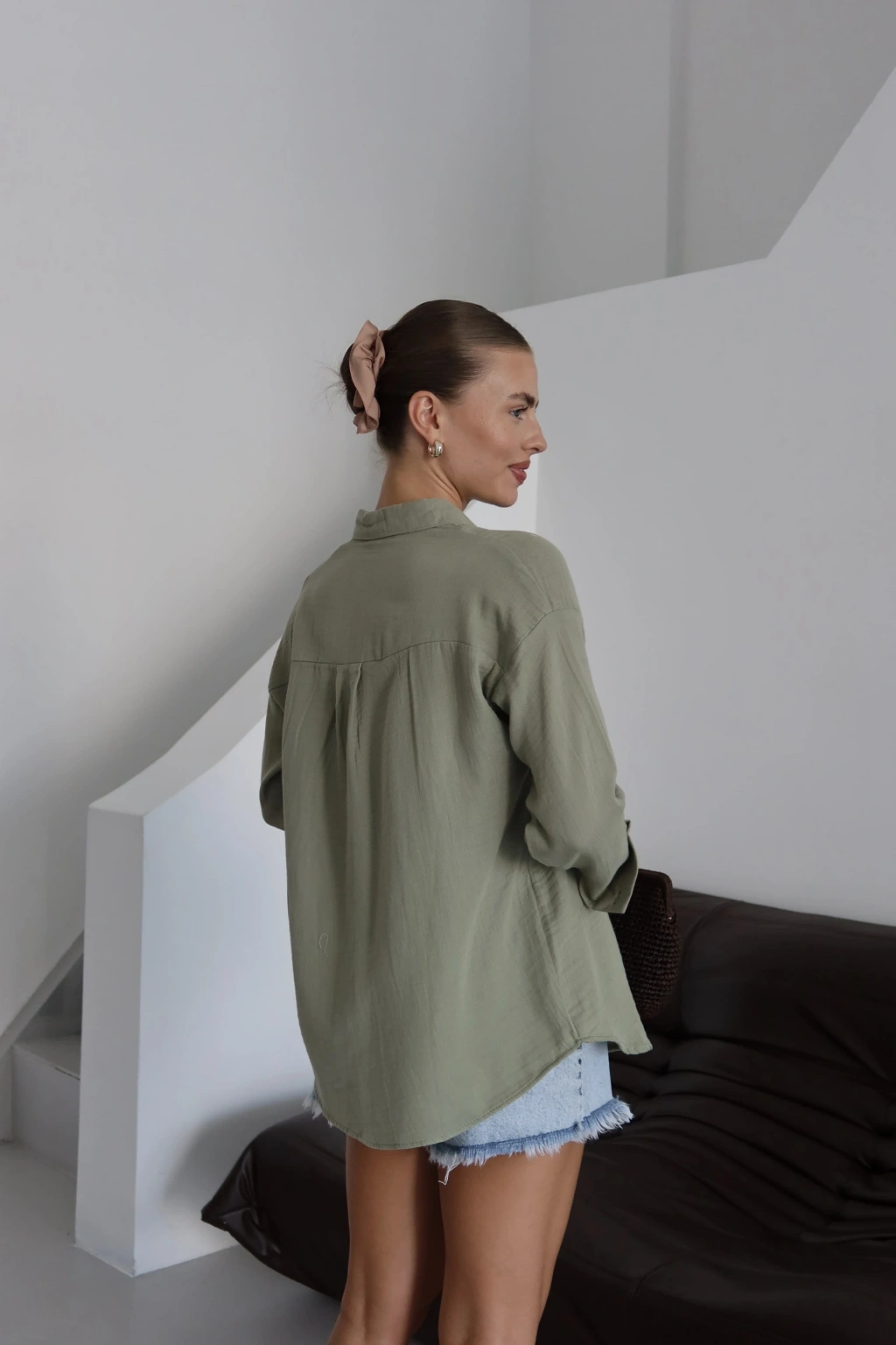 Bu haki rengiyle şıklığı ve rahatlığı bir arada sunan tek cepli müslin gömlek, gardırobunuzun vazgeçilmezi olmaya aday! Yuvarlak yakalı ve düğmeli olan bu gömleğin özellikleri şöyle:
