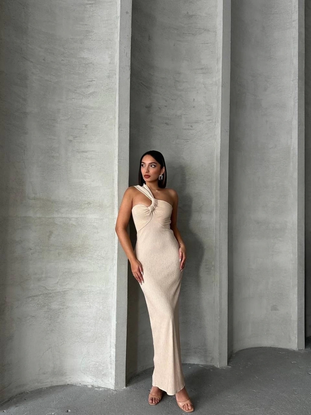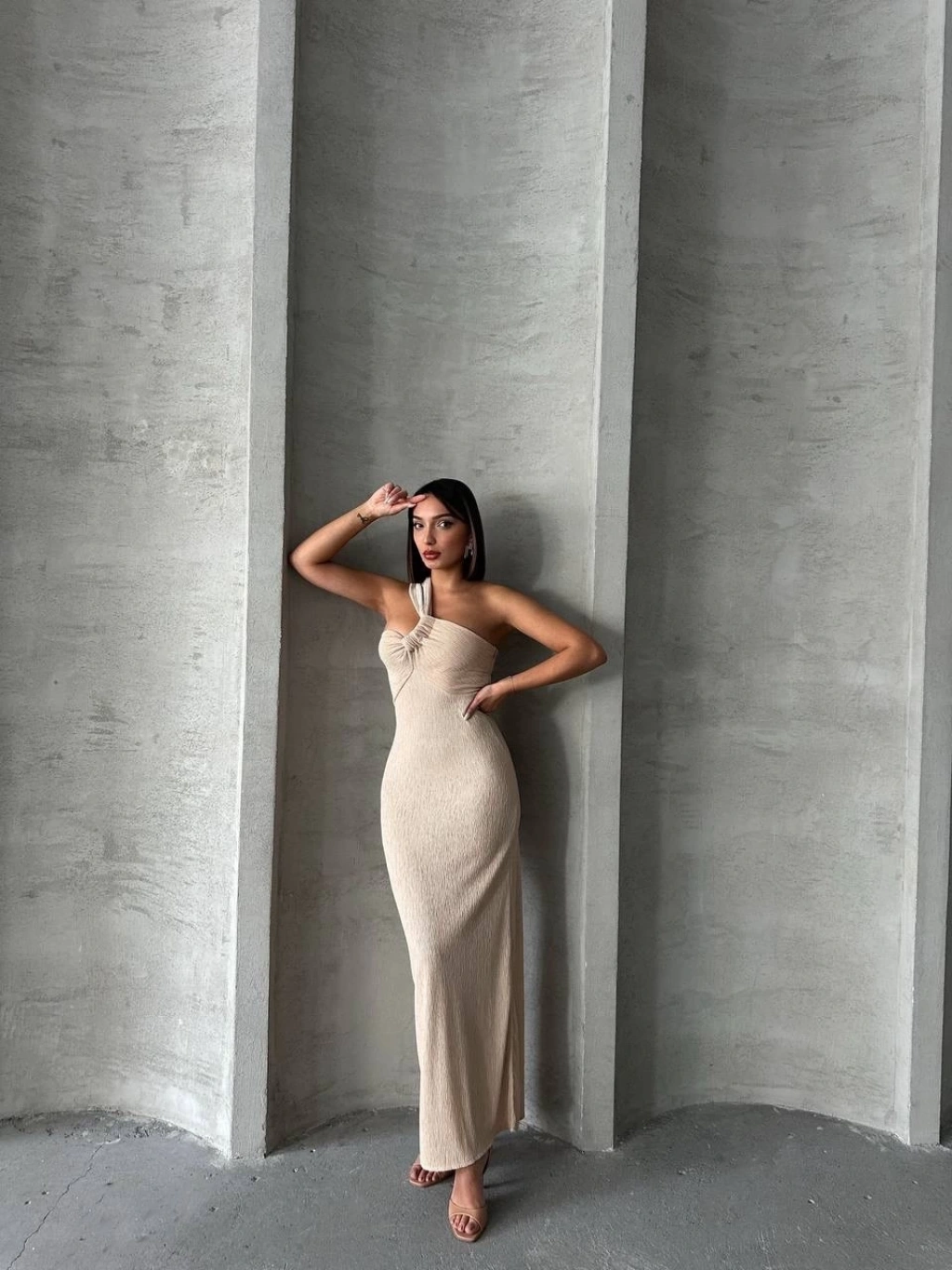 KAZAX marka tek omuz pliseli elbise, şıklık ve zarafeti bir araya getiriyor. Bu tasarım, özel davetlerde ve özel günlerde kendinizi prenses gibi hissetmenizi sağlar.