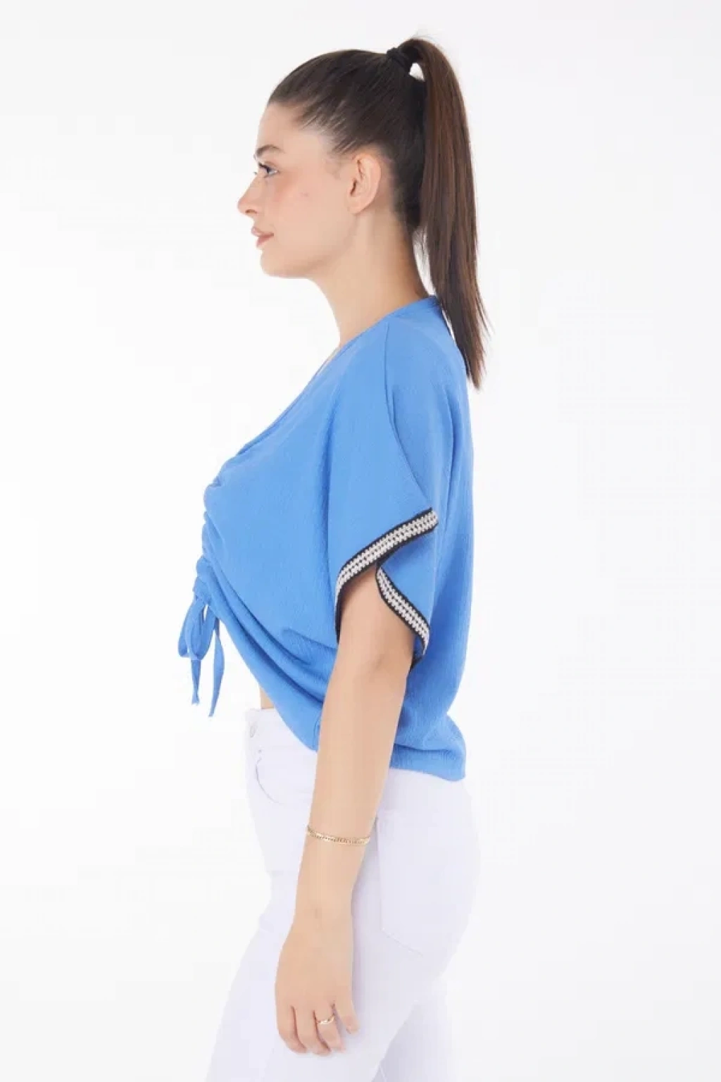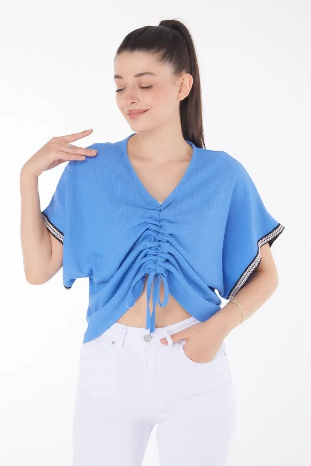 İşte şıklığı ve şıklığı bir arada arayan kadınların tercihi olan KAZAX V yaka büzgülü detaylı bluzu, hem günlük hayatta hem de özel günlerde rahatlıkla tercih edebilirsiniz.