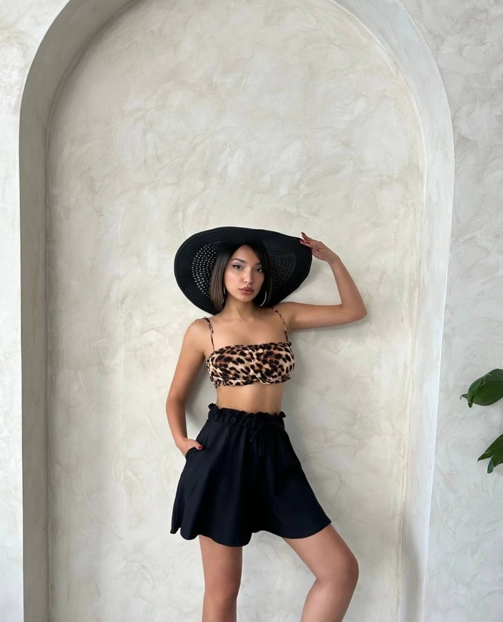 Omuz kısmında yer alan volan detayı ise şortu farklı kılarak tarzını ön plana çıkarır.