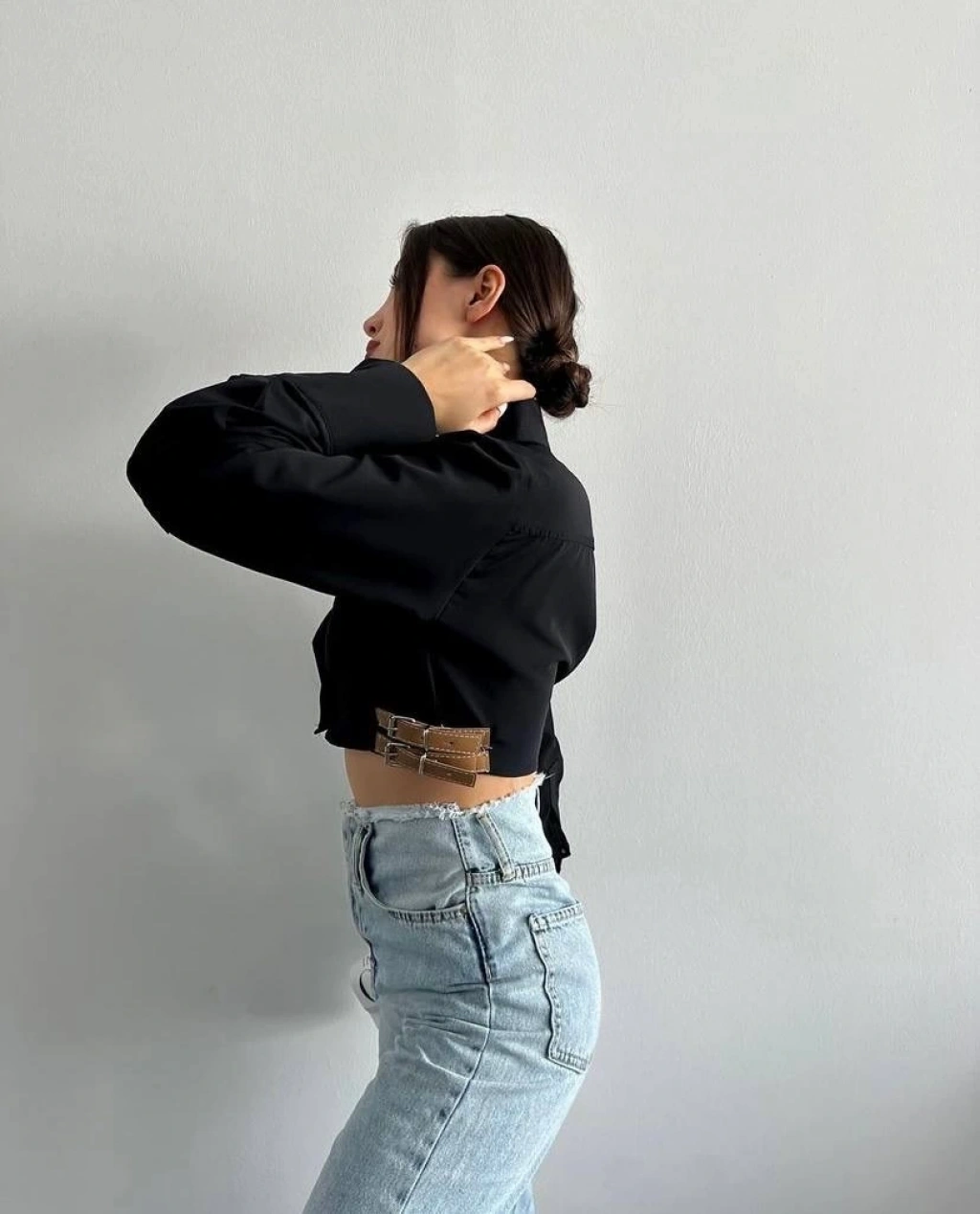 Yanı Kemer Detaylı Crop Gömlek Siyah S4009 ile tarzınızı tamamlayın! Bu crop gömlek, şıklığı ve rahatlığı bir arada sunar.